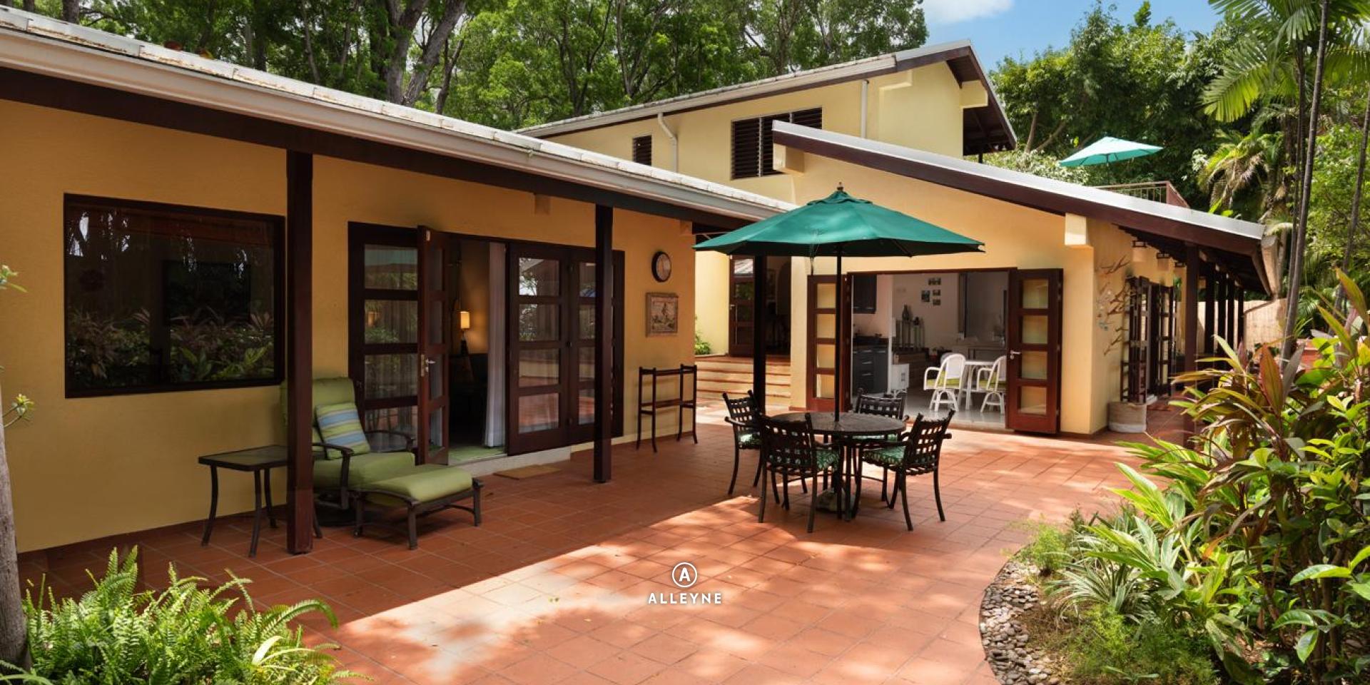 The main house features a spacious, open-plan living area that flows effortlessly to a covered terrace—ideal for al fresco dining or relaxing while enjoying the Caribbean breeze. A plunge pool lies just off the patio, perfect for cooling off in a peaceful garden setting.