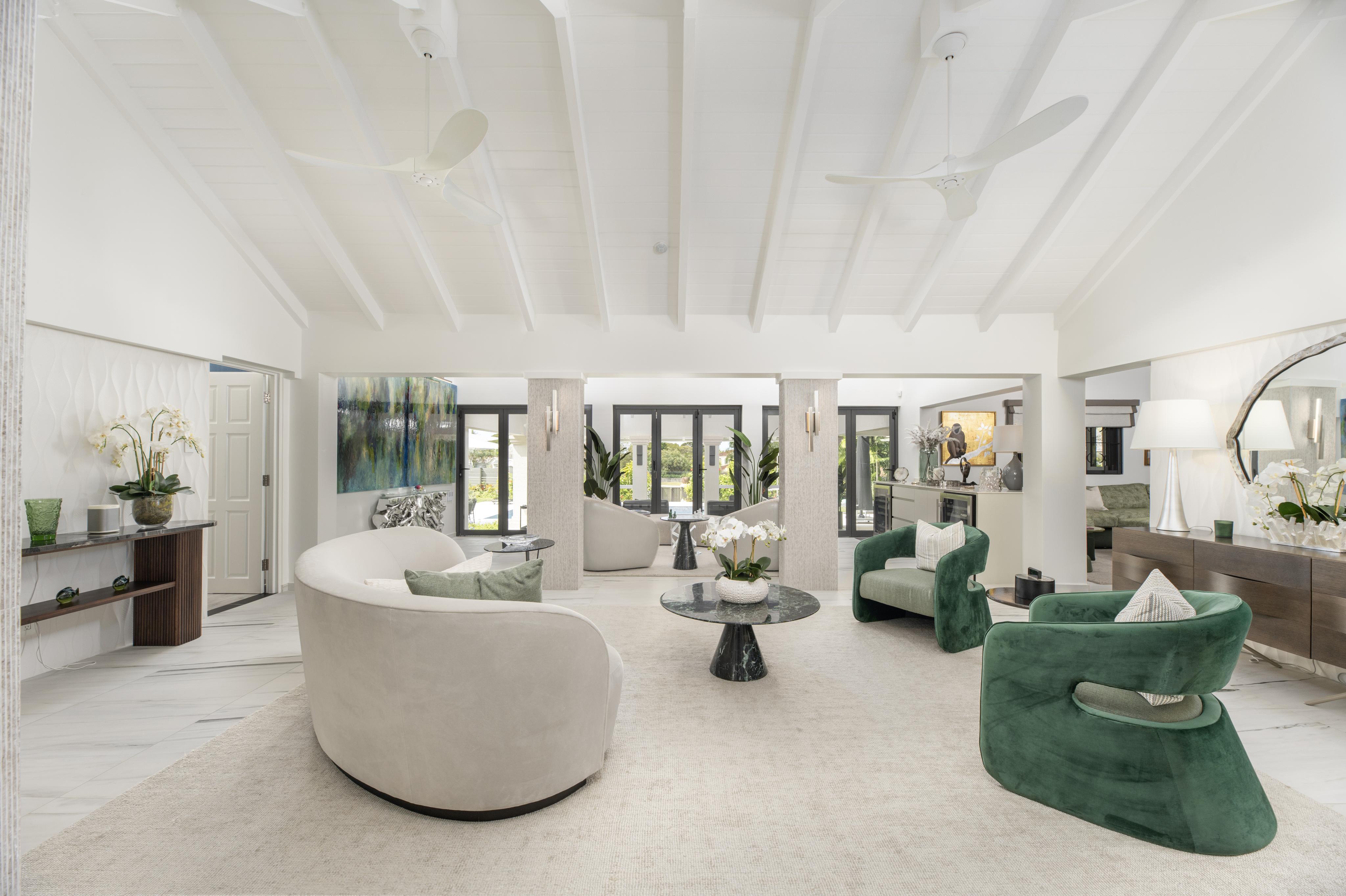 Nestled within the prestigious Sandy Lane Estate, Mahogany Grove stands as a masterpiece of modern luxury and thoughtful engineering. This exceptional property seamlessly blends a three-bedroom main residence with a private two-bedroom cottage, finished to the highest standards. A welcoming water feature defines the approach to the home. Upon entering, the sophisticated tone is immediate, with illuminated artwork walls leading into an interior of pure elegance.