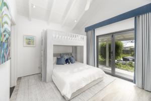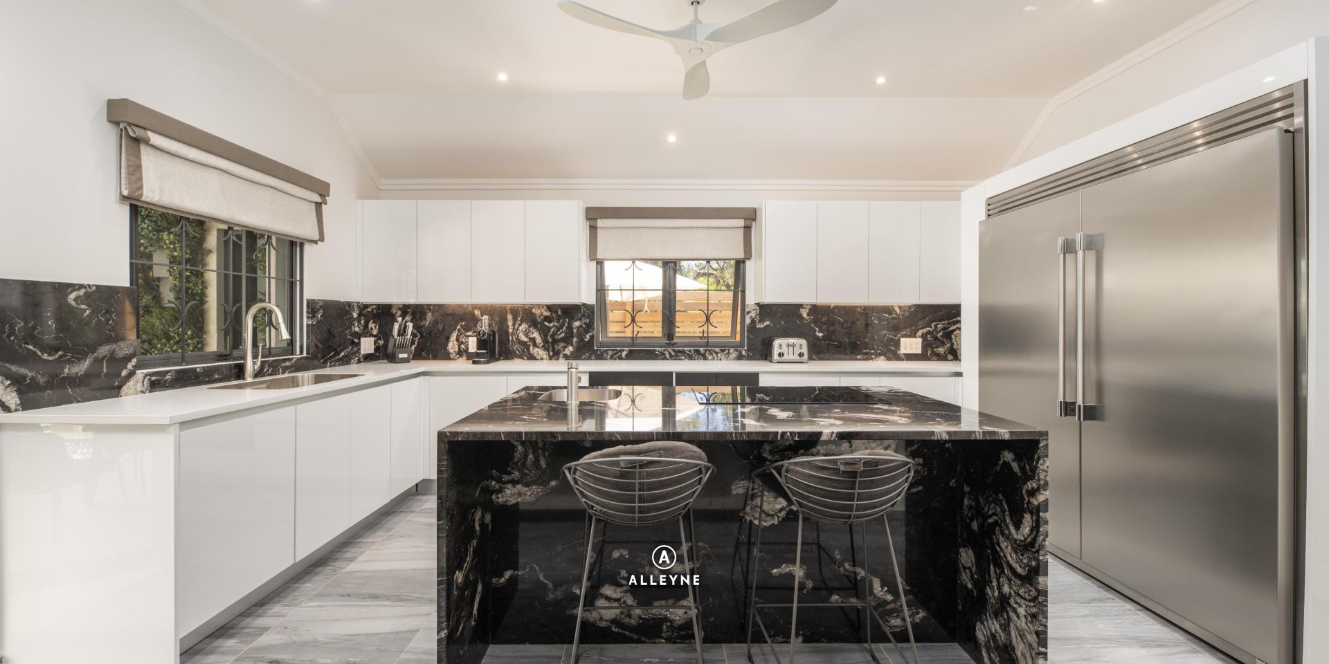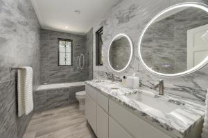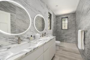 The two-bedroom cottage offers a completely self-contained retreat, mirroring the main house’s commitment to luxury and fine materials. Its full kitchen is centered around a marble topped island, ensuring guests have every convenience at their fingertips. The living area is elevated by a striking marble wall, while the ensuite bathrooms and bedside tables continue the theme with elegant marble surfaces. With its own separate stackable washer and dryer, private safe, and dedicated solar hot water system, the cottage provides a private living experience for visitors or family.