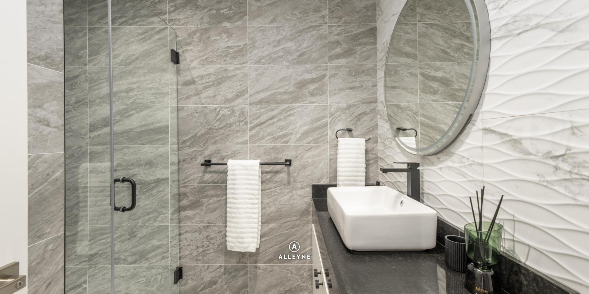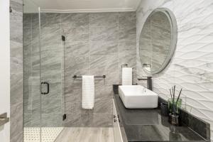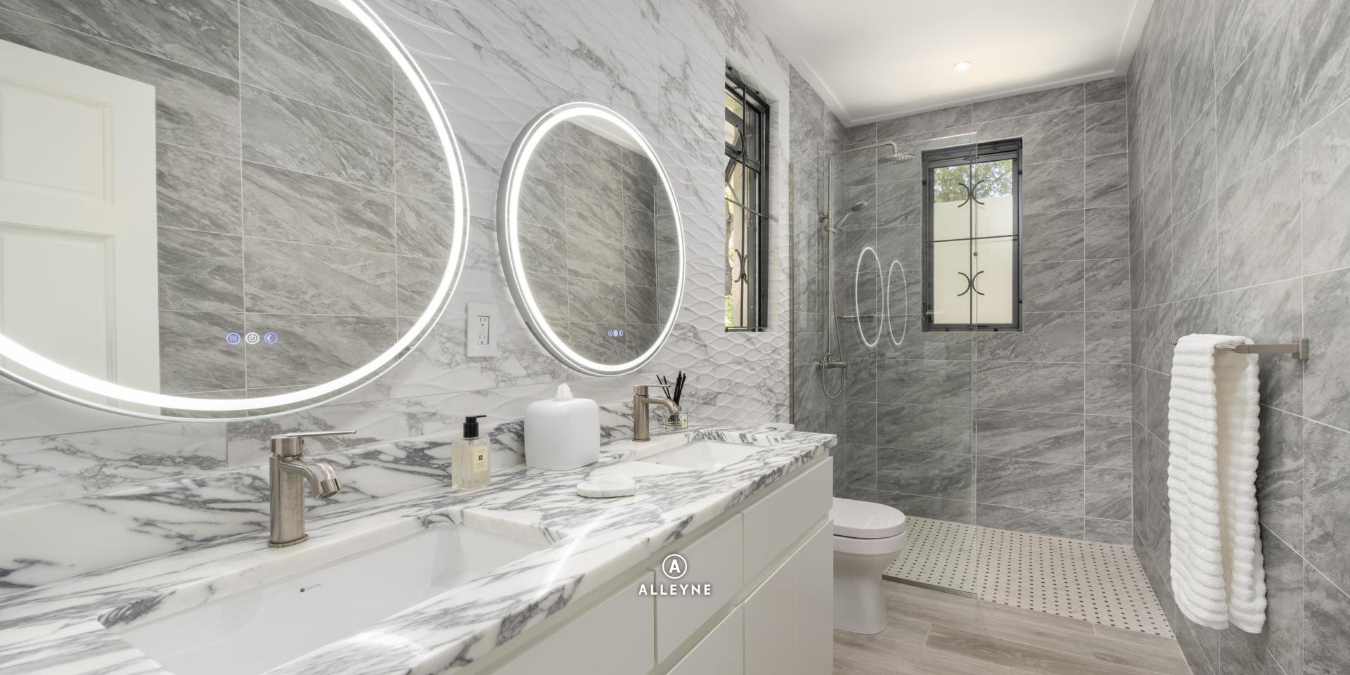 The master suite and guest bedrooms in the main house are designed as serene retreats that prioritize both comfort and high-end technology. The master suite features a bespoke pop-up television integrated into a custom credenza at the foot of the bed, allowing for seamless entertainment that disappears when not in use. Organization is elevated by a spacious master closet finished with elegant marble countertops, while the en suite bathrooms provide a spa like atmosphere with dual vanities and dual heated, lighted vanity mirrors.