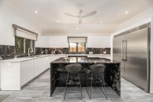 The culinary heart of the main house is a sanctuary for enthusiasts, equipped with a large island featuring a marble top and integrated sink. High end functionality is at the forefront with a double door side by side fridge and freezer, electric stove top, dual ovens, and dual microwaves.