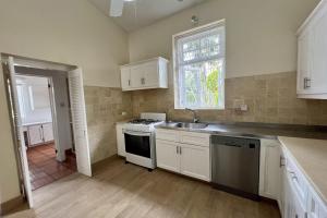 The living and dining areas sit four steps below the bedrooms, creating a distinct open-concept space that is air-conditioned and extends cooling to the kitchen, which comes equipped with a fridge, stove, and dishwasher. An air-conditioned office with a separate entrance is conveniently located just off the kitchen, ideal for remote work.